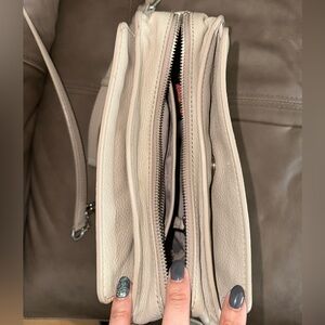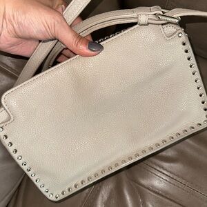 Elegant light gray pebbled leather bag with silver studs. Features a chic chain strap. In excellent used condition.