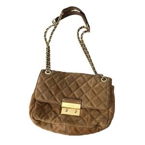 Michael Kors Sloane bag in suede tan quilted style. Chain can be adjusted to crossbody or shoulder wear. Pinch lock closure. Interior has zip pocket plus card slots. Very good preowned condition. Approximately 9.5” x 7” x 3”