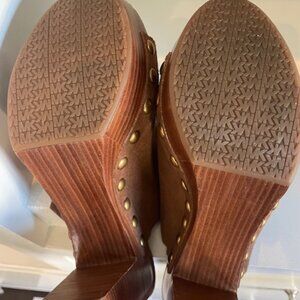 Interwoven suede upper, open-toe, slip-on clog/mule. Stacked block heels with Michael Kors logo plate on back of heels, Padded leather insole, Gold Studs on sides, Approx. 4 1/2” heel, 1 1/2” platform, Rubber under-sole. Gently worn.