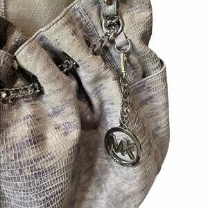This Michael Kors grey sueded leather snakeskin purse is in great condition. Has a detachable silver MK keychain. Two outside side pockets great for cellphone. 1 interior zip pocket and 3 other interior pockets. Silver chain around top of purse. Snap closure. Grey interior. Comes with dust bag.