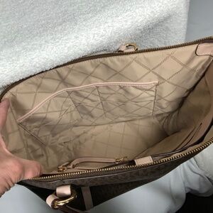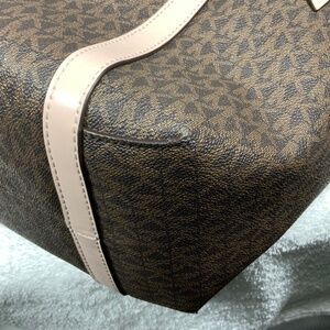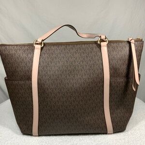 • Signature Brown Logo Coated Canvas with Pink Leather Trim and gold tone hardware