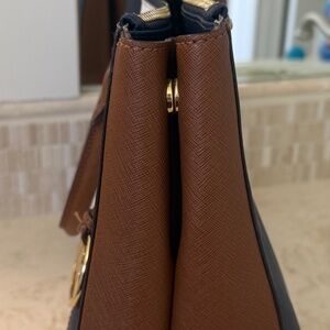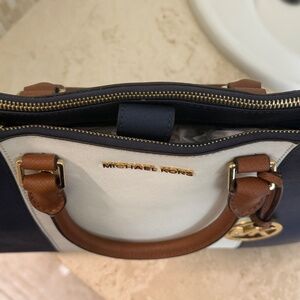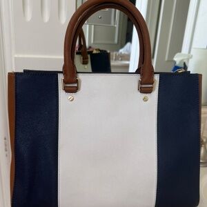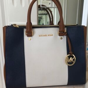 Nave Blue and white with brown sides and handle. Gold accents, made of saffiano leather. This is in used, very good condition. Most wear is seen on the gold feet on the bottom. Interior has two top zip pockets, one interior zip pocket, three open pockets, one cell phone pocket, one key fob. MK Charm. There is a stain on the open interior pocket that is pictured above. There is a removable strap to make the bag a shoulder/crossbody bag.