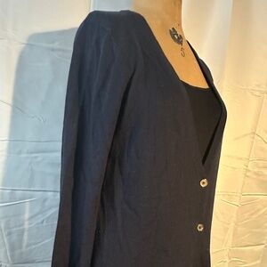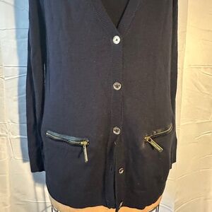 Michael Kors Navy blue cardigan sweater with gold buttons, zipper pockets with leather trim detail