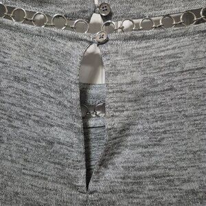 Michael Kors long sleeve sweater, size Large. Gray metallic shimmer fabric, Polyester and Elastane blend, embellished neckline, keyhole buttoned closure. Approximate measurements: chest 38", length from shoulder 25" and 24" sleeve. Pre-owned, gently worn and in beautiful condition.