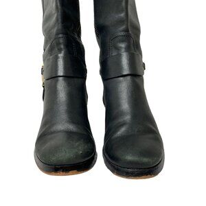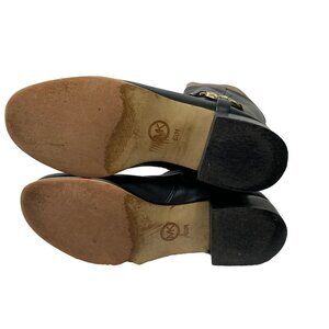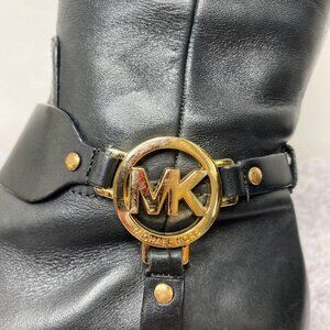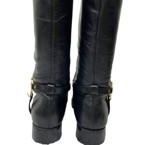Michael Kors Sz 6.5 Tall Riding Boots Gold Logo Fulton AA125F Harness Black/Brow