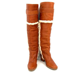 Tall pull on brown leather sherpa boots. Adjustable belt around the top of boot with silver hardware.