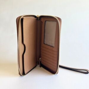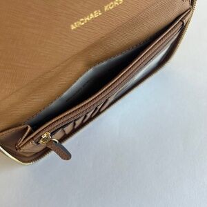 Michael Kors Tan Genuine Pebble Leather Zip Around Wallet. 7”W x 4”H x 1”D, gold hardware, two components, one zipper pocket, one ID holder, six card holders. In great condition, no signs of wear, gently use a few times.