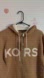 Tan hoodie featuring bold white lettering. Classic zip-up design. Perfect for casual wear.