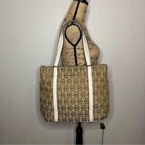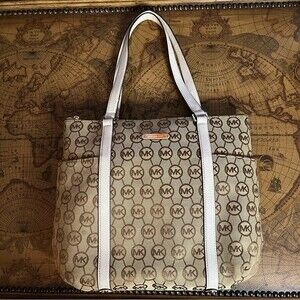Michael Kors Tan Jacquard Jet Set Large Zip Tote White Leather Strap Side Pocket