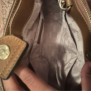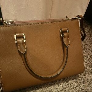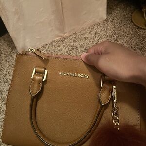 Chic and practical, this Michael Kors crossbody is crafted from soft tan leather and comes in great condition. It features gold-tone hardware, an adjustable strap, and comes with a cute maroon MK puff ball charm for a pop of color.
