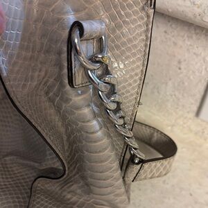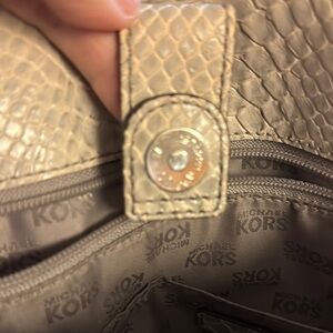 Elevate your style with this elegant Michael Kors handbag. Crafted in a sophisticated light tan leather, this bag is perfect for any occasion. The luxurious design and practical size make it a must-have accessory.