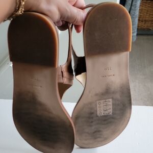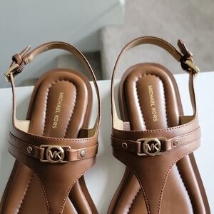 Elegant tan leather sandals with signature gold logo. Ideal for summer outings. only worn one time. like new. very comfy