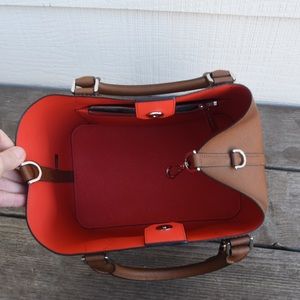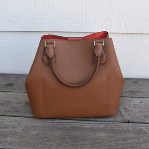Elegant tan leather tote. Features signature logo charm. Perfect for everyday use.