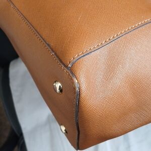 Elevate your style with the Michael Kors Tan Leather Tote Bag. Perfect for any occasion, this elegant bag combines functionality with a chic design. The rich tan color adds a touch of sophistication to your ensemble. Some strap issues and interior cleaning needed.