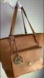 Chic Michael Kors tote in tan leather. Features gold-tone hardware and front pocket. Ideal for everyday use.