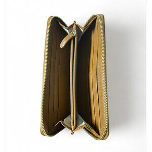Elegant tan leather wallet. Features gold-tone hardware. Sleek and stylish design.