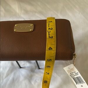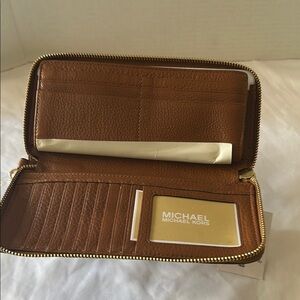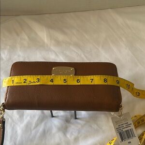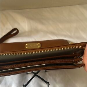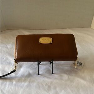 Elegant tan leather wristlet with gold-tone hardware. Perfect for any occasion.