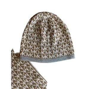Like New Michael Kors Tan Logo Scarf and Hat Set, no tags. 100% Acrylic logo beanie and matching scarf. Gray trim