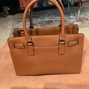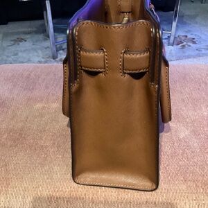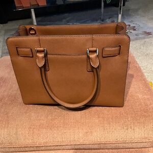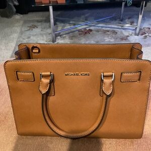 Michael Kors tan saffiano leather top handle bag in excellent condition. No marks anywhere. Michael Kors signature fabric interior with zippered side pocket and center zippered pockets and two cell phone pockets. Shoulder strap included. Gold colored hardware.