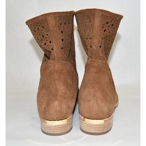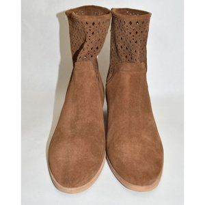 Elegant tan suede booties with cut-out design. Perfect for versatile styling.