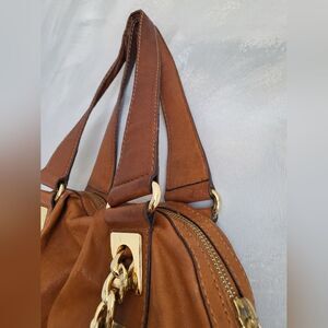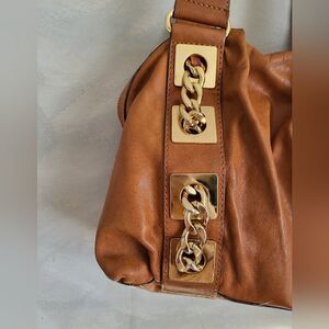 Michael Kors Tan Top Handle Shoulder Bag Gold Fisherman Chain Accents Slouchy Nuetral Rust Color