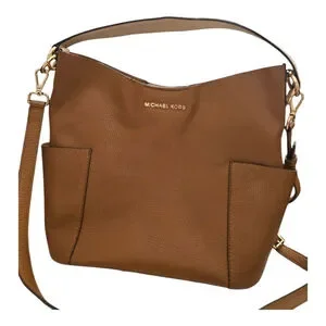 This is a Michael Kors shoulder bag in a rich brown, pebbled leather, featuring a contrasting beige interior and strap accents. The bag has a soft, slouchy silhouette with two exterior slip pockets and a gold-toned "MICHAEL KORS" logo on the front. It includes both a short shoulder strap with gold-toned hardware and a longer, adjustable crossbody strap. The interior reveals a main compartment with a magnetic snap closure and a removable zippered pouch, lined with a patterned fabric. The bottom of the bag shows a clean, oval shape.