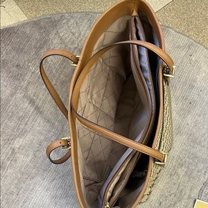 Chic Michael Kors tote with signature logo pattern. Ideal for daily essentials. Stylish and versatile. Minor red pen stain in one pocket (noted in picture) Zippers still wrapped. Almost new.