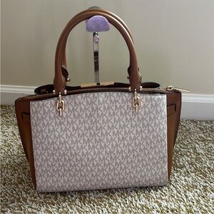 Chic Michael Kors satchel with signature MK pattern. Stylish tan handles and trim. Perfect for everyday elegance.