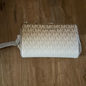 Elegant Michael Kors wristlet with tan and white pattern. Ideal for travel and daily use.