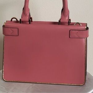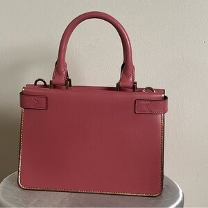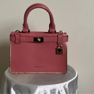 Chic Michael Kors satchel in rose. Features gold hardware and lock detail. Perfect for elevating any outfit.