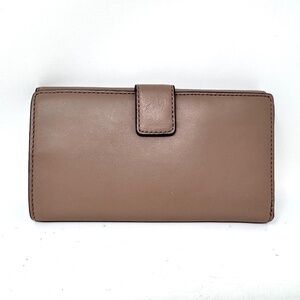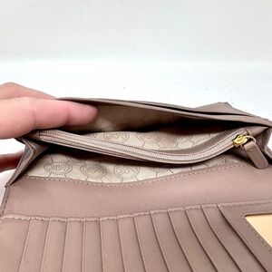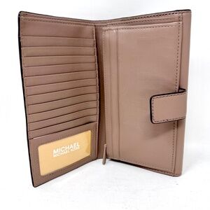 Wallet has two sides. One side opens up to an open pocket. The other side opens to 3 large slots, a zippered change pocket, 11 card slots, and one picture ID slot, and a large slip pocket behind the card slots. Both sides have snap closures.