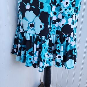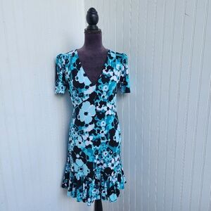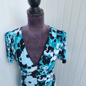 Michael Kors Teal Black Floral Knit Short Sleeve Classic Sheath Dress Stretch S