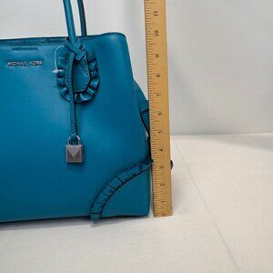 Michael Kors purse, blue handbag, leather tote bag, ruffled purse, crossbody bag, structured handbag, adjustable strap bag, designer handbag, leather bag, women's purse, zipper closure bag, durable tote, stylish bag, teal, birthday, gift,