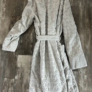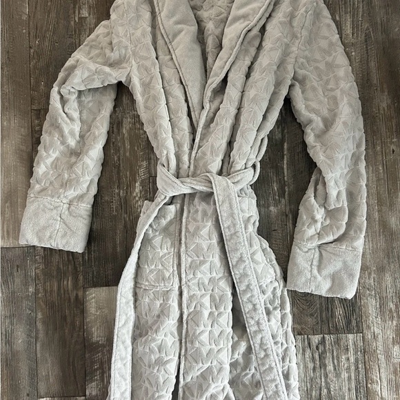 Luxurious gray robe with textured pattern. Soft and comfortable. Perfect for lounging.