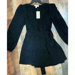 This stunning Michael Kors wrap dress in black is perfect for any special occasion. The V-neckline and tie closure give it a touch of elegance, while the tonal Swiss dots add a subtle sparkle. The dress has long sleeves, making it suitable for any season.