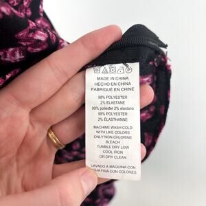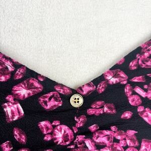 Black with pink and purple jewel print, button on front, smocked stretchy back.