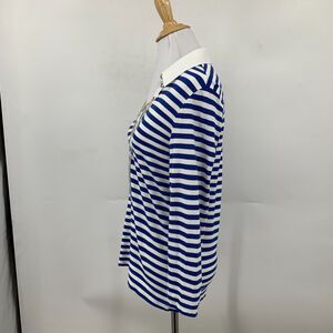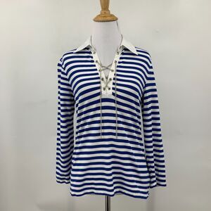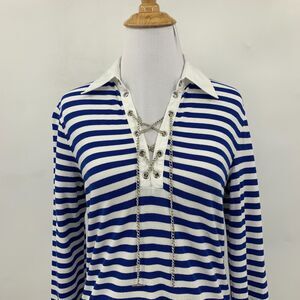 MICHAEL KORS TOP WOMEN M MEDIUM WHITE BLUE STRIPED CHAIN LATTICE COLLARED V NECK