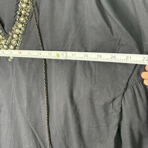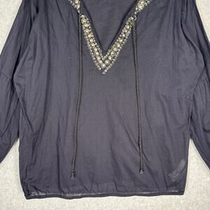 Michael Kors Top Womens Large Navy Blue Embellished Popover Thin Boho Blouse Beaded Sequins Tasseled Lightweight Bohemian Hippie 100% Cotton Long Sleeve V Neck
