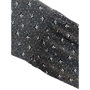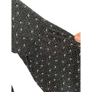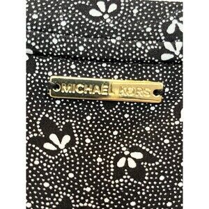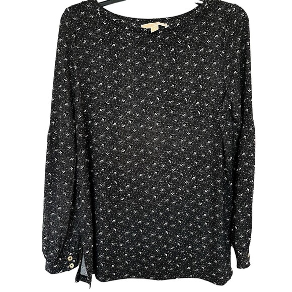 Michael Kors Top Womens SZ M Black White Tiny Floral Print round neck pull over tunic style. Sleeves have extra flair at half way down then a two button cuff. Back has the gold tone logo bar for Michael Kors sewn in. Buttons are gold tone. material is very stretchy. Most likely a polyester and spandex mix.