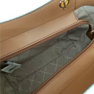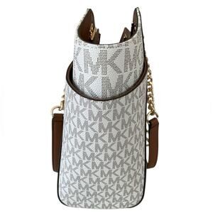 Elevate your style with this elegant Michael Kors tote bag. Featuring a chic white & brown design with gold accents, this bag is perfect for any occasion. The spacious interior and stylish chain straps make it both practical and fashionable.