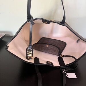 Brown MK pattern on body with a leopard stripe down the front surrounded by gold studs. (I wish I was surrounded by gold studs.). Magnetic snap closure. 2 top handles. Detachable pouch with snap closure. About 18 inches wide at the top and about 12.5 inches at the bottom (it's tapered, just like jeans from the 90's.). Bottom is 5.5 inches wide, so lots of room to carry all your treasures. About 12 inches high. (I don't measure perfectly). Hardly any signs of use. In fact, I can't see any, except for a little dust in the interior. Cat friendly but non-smoking home. (My cat doesn't know how to smoke.)