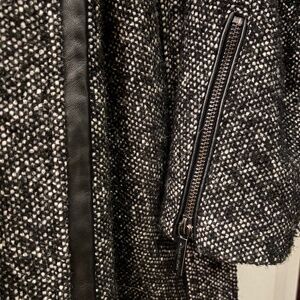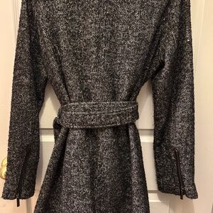 Michael Kors Tweed Belted Trench Coat - Stylish and chic, this black and white textured trench coat features faux leather accents, an asymmetrical zip closure, and zippered pockets for a sleek, modern look. Complete with a matching belt to cinch the waist, it’s perfect for elevating any fall or winter wardrobe. Excellent condition!