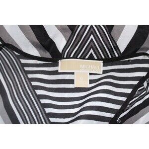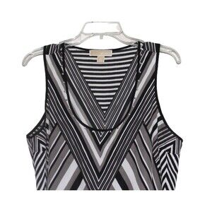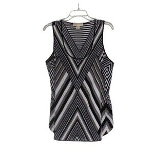 Michael Kors hi low tunic top. Black and white striped. veckline and hem heace silver sequins.Collarless v-neck, sleeveless. 100% polyester. Machine washable. Womans size 12. No rips, tears, holes or stains.