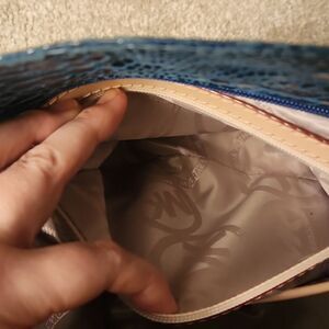 There is a large area on the back side of the bag (photos) that is darker than the rest. I am not sure if that is due to color/dye transfer or even a stain, but I wanted to point it out. Price reflects this imperfection.