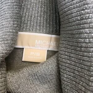 Silver sweater by Michael Kors. Turtleneck. Cowl neck. Shimmering metallic threads. Long sleeve sweater. Size small. 55% cotton, 23% acrylic, 14% polyester, and 8% metallic. Elegant. Classic. Glamorous. Perfect for the holidays, parties, dinners, etc. Pair with solids in any color or have fun with sequined pants or skirts for a party-ready look. In excellent condition.