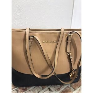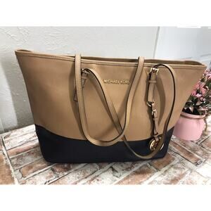 * Michael Kors Two Tone Jet Set Travel Tan/Black Tote Shoulder Handbag Purse Bag