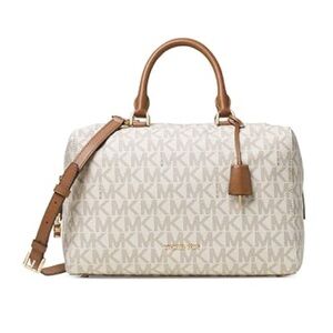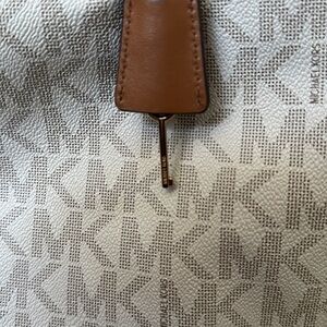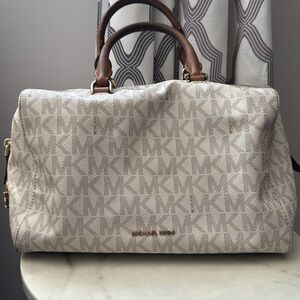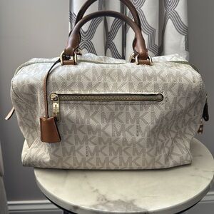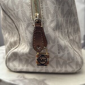 It features a top zip closure, a flat base with metal feet, and a lined interior with a back wall zip pocket and two slip pockets. The exterior is adorned with the Michael Kors logo pattern. Signs of wear on handles.