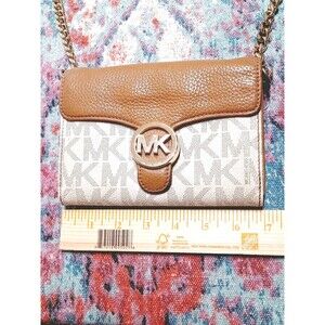 The Michael Kors Vanna Mini Crossbody Purse in Tan Leather and Vanille Monogram is a stylish and functional accessory. This crossbody purse features a magnetic and snap closure, a brown leather crossbody strap, and gold hardware accents. Perfect for travel, casual, or business occasions, this purse includes inner and outer pockets, inner dividers, and a water-resistant exterior made of pebbled leather and coated canvas . The signature Michael Kors monogram adds a touch of luxury to this classic yet trendy designer piece. You can detach the strap and us as a wallet or clutch. EUC