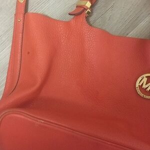Chic and versatile Michael Kors tote. Vibrant orange hue. Perfect for daily use. Elegant design with signature charm. Some stains on both interior and exterior, but still excellent quality of Michael Kors leather goods. Will last a lifetime. No interior pockets. Snap closure from sides.