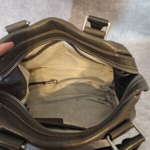 in good used condition, some staining inside the bag, a small ink mark on the outside, scuff on the bottom.